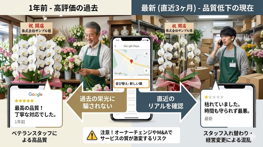 花屋の評価を見る際は、総合点(星4.5など)ではなく、「直近3ヶ月の投稿」に集中してください。 なぜなら、生花店、特に東京の激戦区にある店舗は、経営体制やスタッフの入れ替わりが非常に激しいからです。1年前にはベテランのフローリストがいて最高のアレンジメントを作っていたとしても、その人が退職していれば、現在の品質は全くの別物になっている可能性があります。特に「胡蝶蘭 東京 即日」のようなスピード勝負のサービスでは、配送スタッフの習熟度がそのまま「遅延リスク」に直結します。