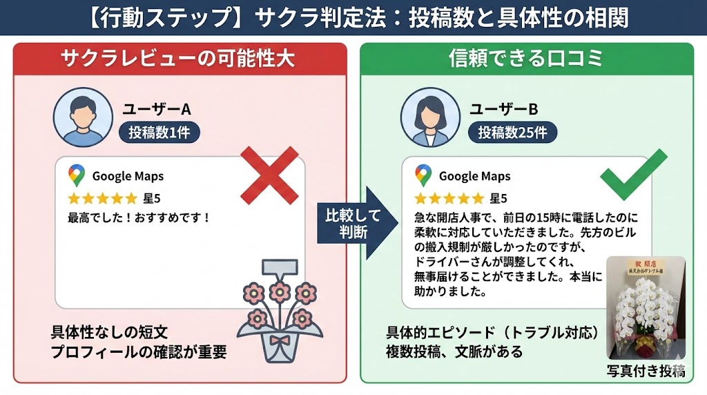 高評価の口コミが並んでいても、その内容が「サクラ」であれば何の意味もありません。 信頼できる口コミかどうかを判断する最も簡単な方法は、投稿者のプロフィールを確認することです。Googleマップでは、投稿者の名前をクリックすると、その人が過去に何件の口コミを投稿しているかが見られます。「投稿数1件」で、かつ内容が「最高でした!」「おすすめです!」といった具体的エピソードのない短文である場合、業者が依頼したサクラレビューである可能性が極めて高いです。