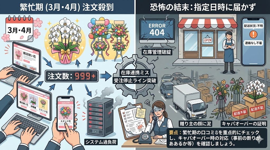 「指定した日時に届かなかった」という口コミが散見される店は、配送業者ではなく「受注管理システム」に致命的な欠陥を抱えています。 特に企業の年度末である3月や、人事異動シーズンの4月、9月は、東京中の花屋に注文が殺到します。実力のある花屋は、自店の配送キャパシティ(トラックの台数やドライバーの人数)の上限に達した時点で、Webサイト上で「売り切れ」や「受注停止」の表示を出します。