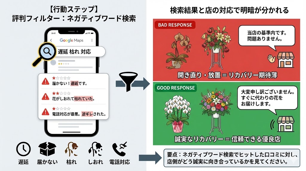 膨大な口コミを一つ一つ読む時間がない場合は、検索機能を使って「地雷」を能動的に探しに行きましょう。 Googleマップの口コミ欄には検索窓(虫眼鏡マーク)があります。ここに、あなたが最も恐れているトラブルに関連するキーワードを入力してフィルタリングします。推奨する検索ワードは「遅延」「届かない」「枯れ」「しおれ」「電話対応」の5つです。