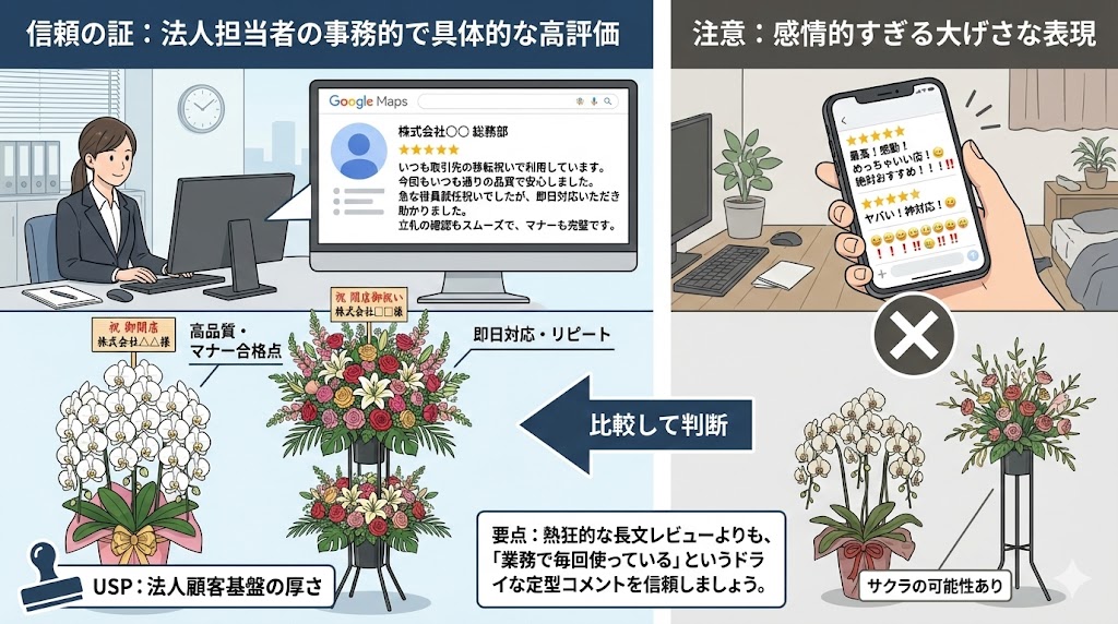 一般社団法人JFTD(花キューピット)のようなネットワークに加盟しているかどうかも一つの指標ですが、それ以上に、地域の企業から「御用達」として指名され続けている事実が重要です。口コミの中に「弊社」「いつもお世話になっております」という言葉が含まれていれば、その店は法人顧客基盤が厚く、ビジネス対応に慣れている(=USPがある)と判断して間違いありません。