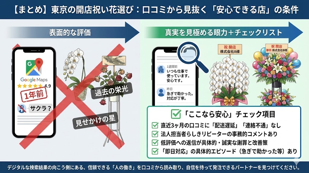 東京での開店祝いで「失敗しない花屋」を選ぶためには、表面的な星の数ではなく、口コミの奥にある「運営体制」を見抜く眼力が必要です。 ここまで解説してきた通り、Googleマップの口コミは情報の宝庫ですが、その見方を知らなければ真実にたどり着けません。「1年前の栄光」ではなく「今の実力」を評価し、サクラを排除し、トラブル時の対応力を見極めることが、あなたの大切なビジネス関係を守ることに繋がります。