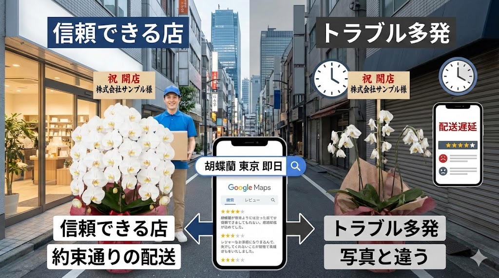 - 「胡蝶蘭 東京 即日」の対応実績が具体的か?「急ぎで助かった」というエピソードが含まれる口コミが複数あるかを見ます。